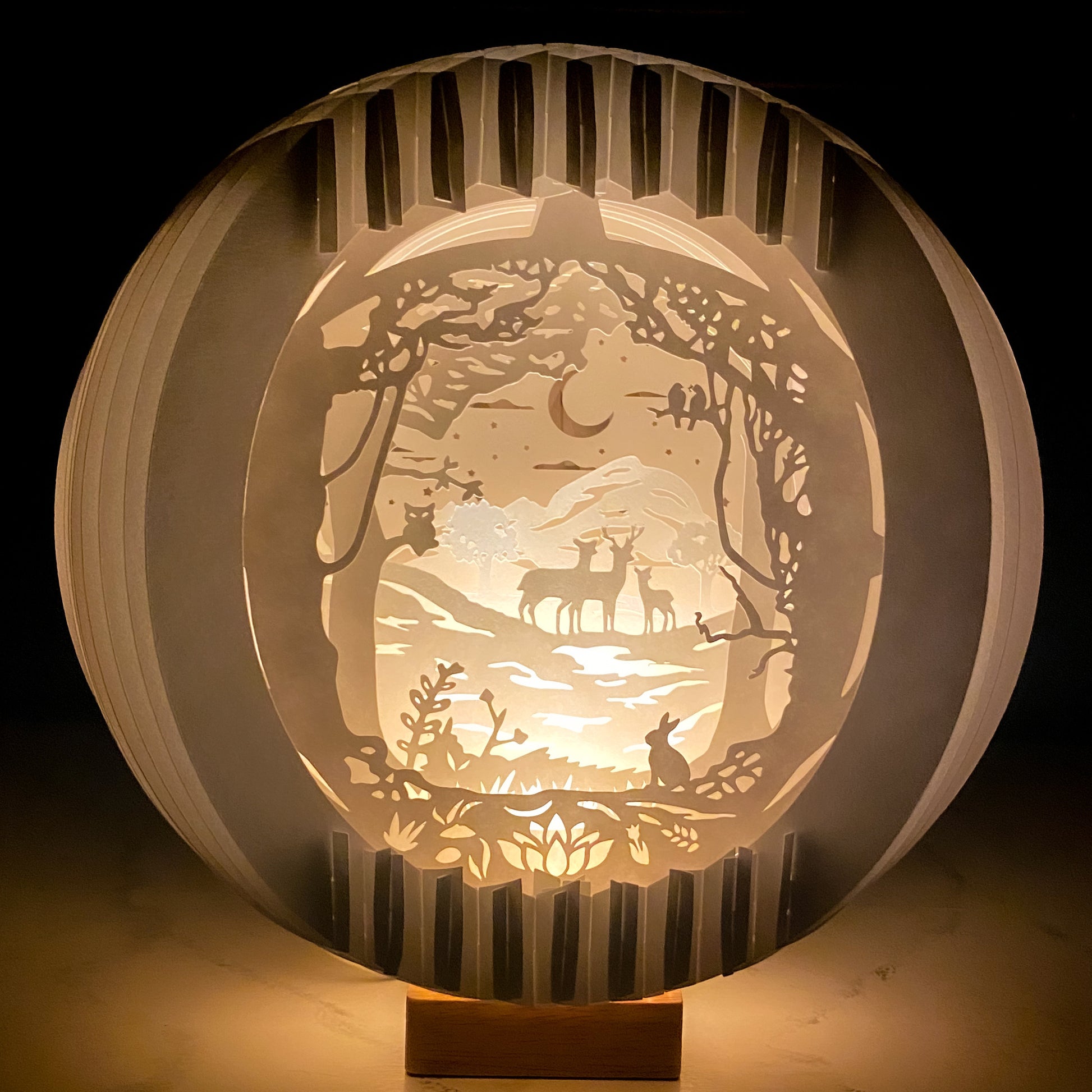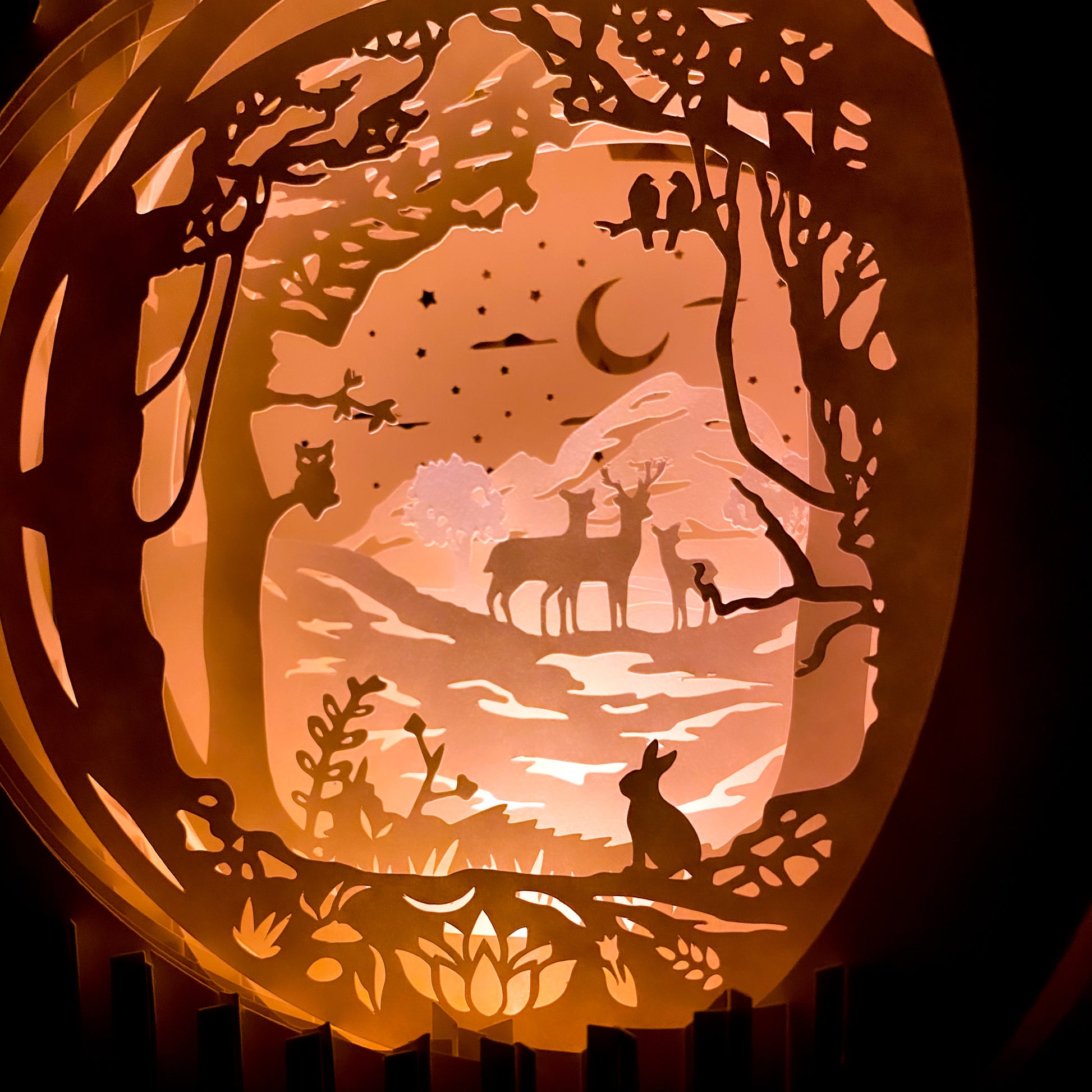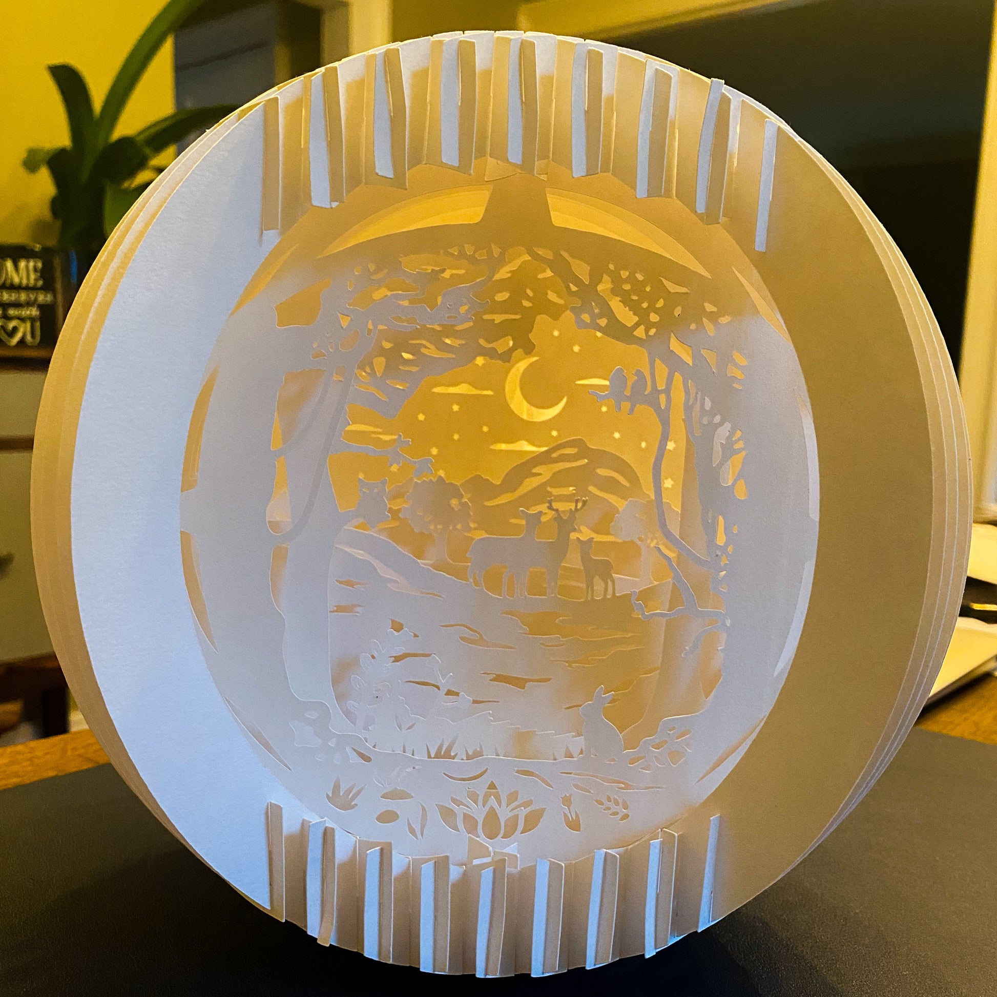Beautiful handmade paper lamp with a whimsical image of deer in a forest.