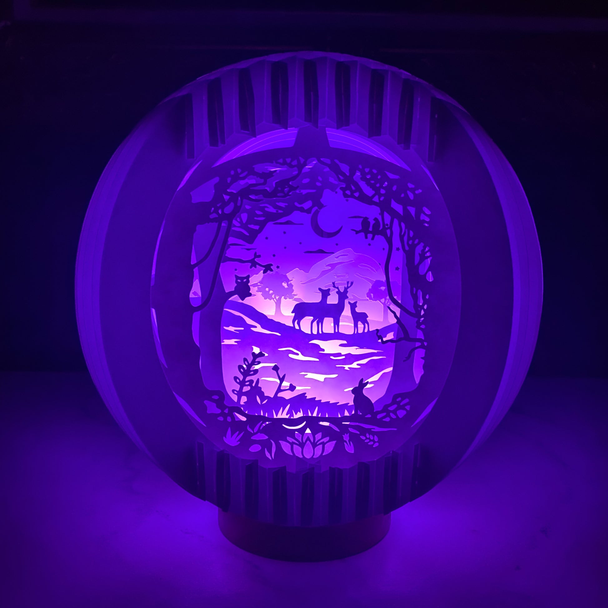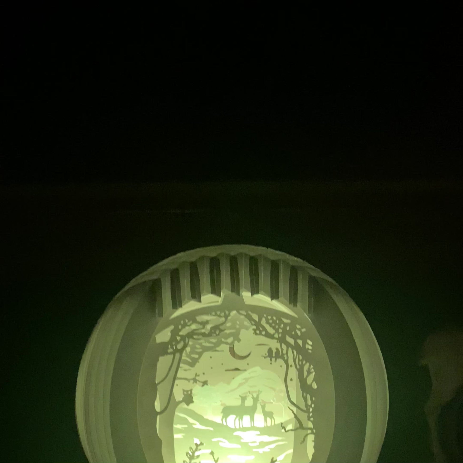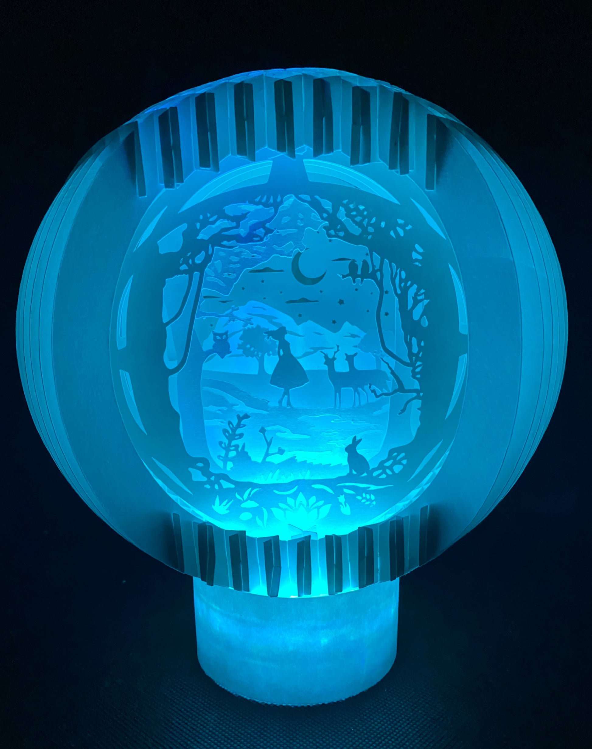 Beautiful handmade paper lamp with a whimsical image of deer in a forest.