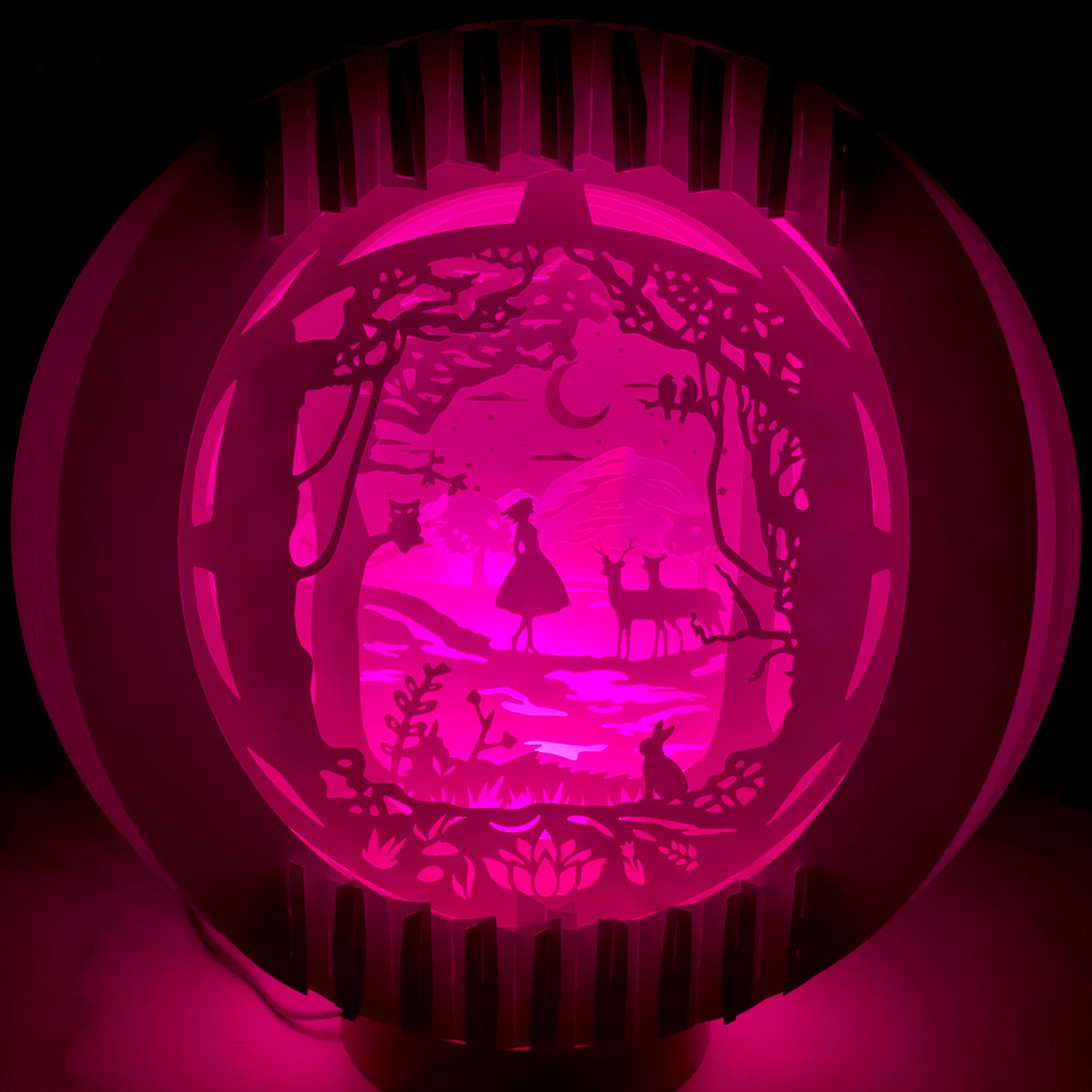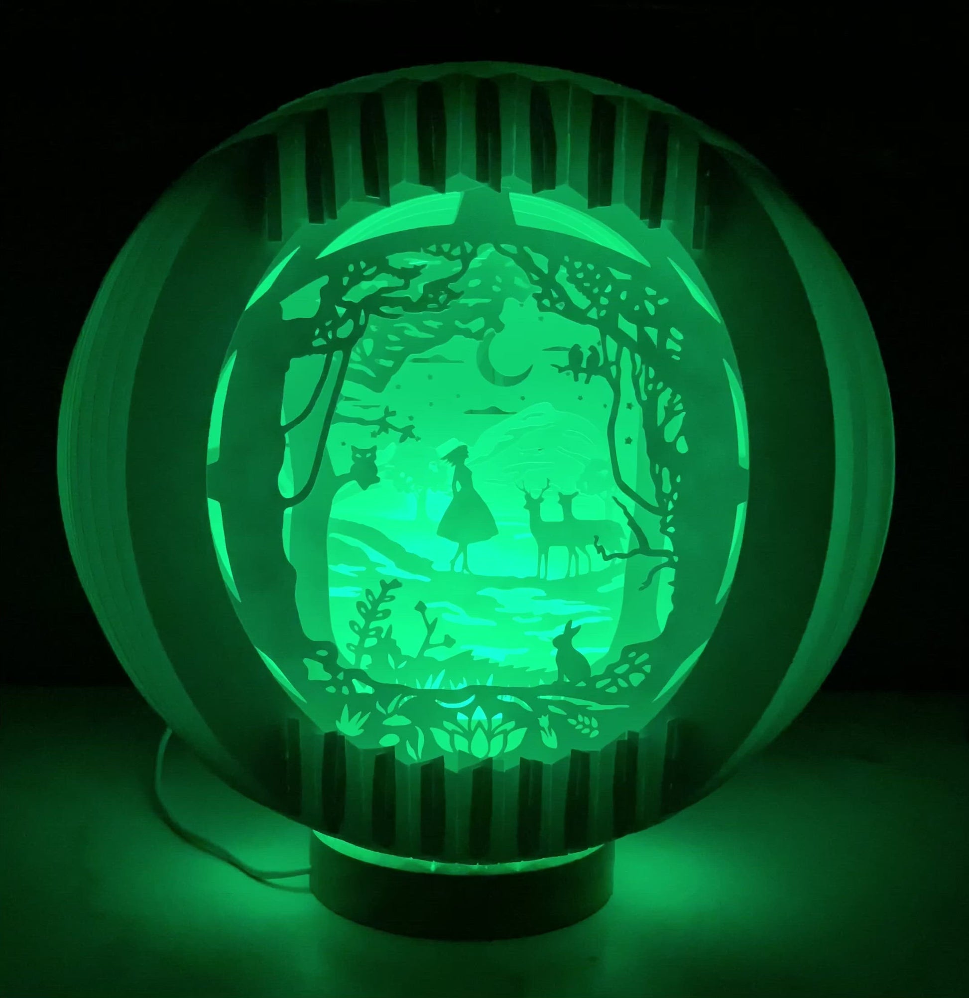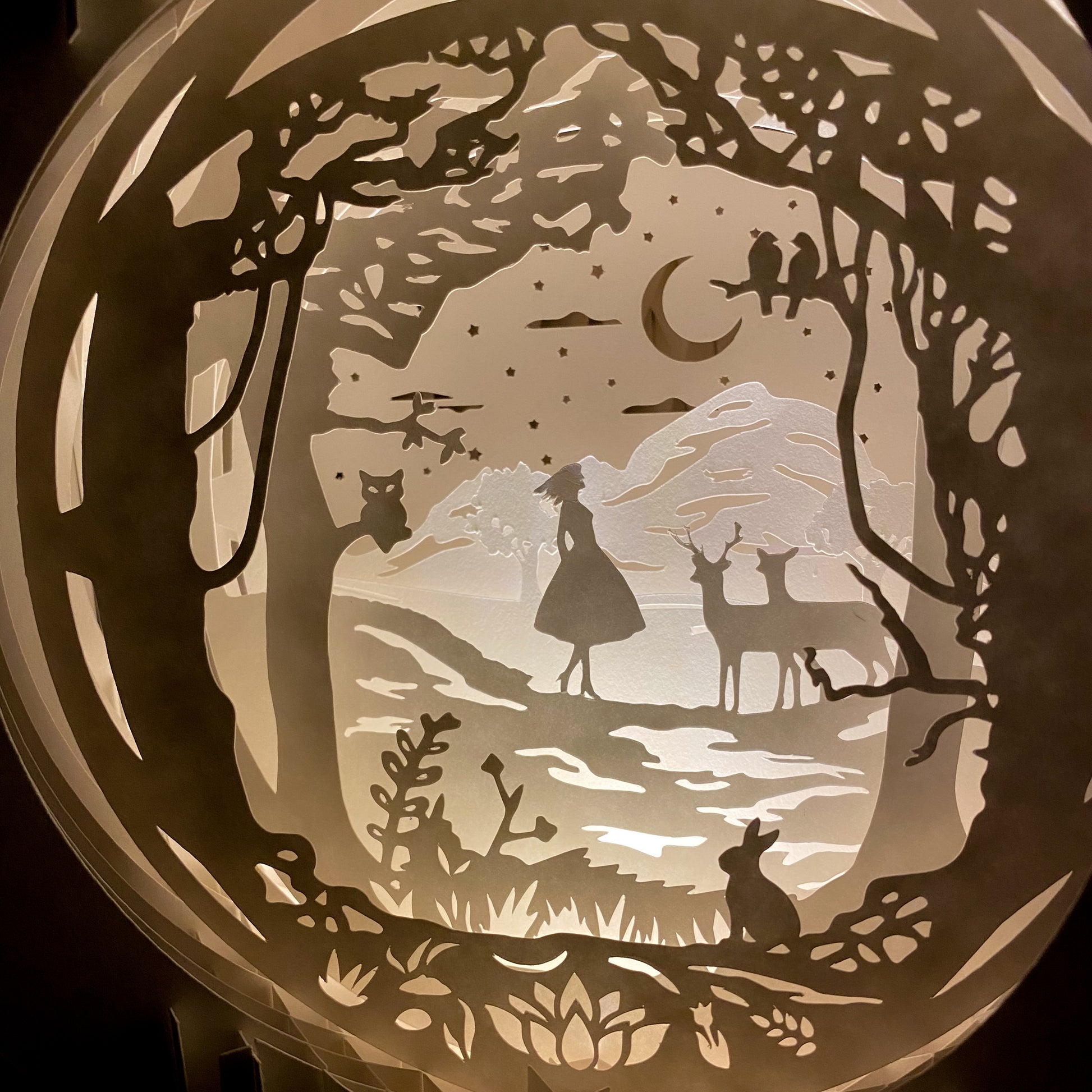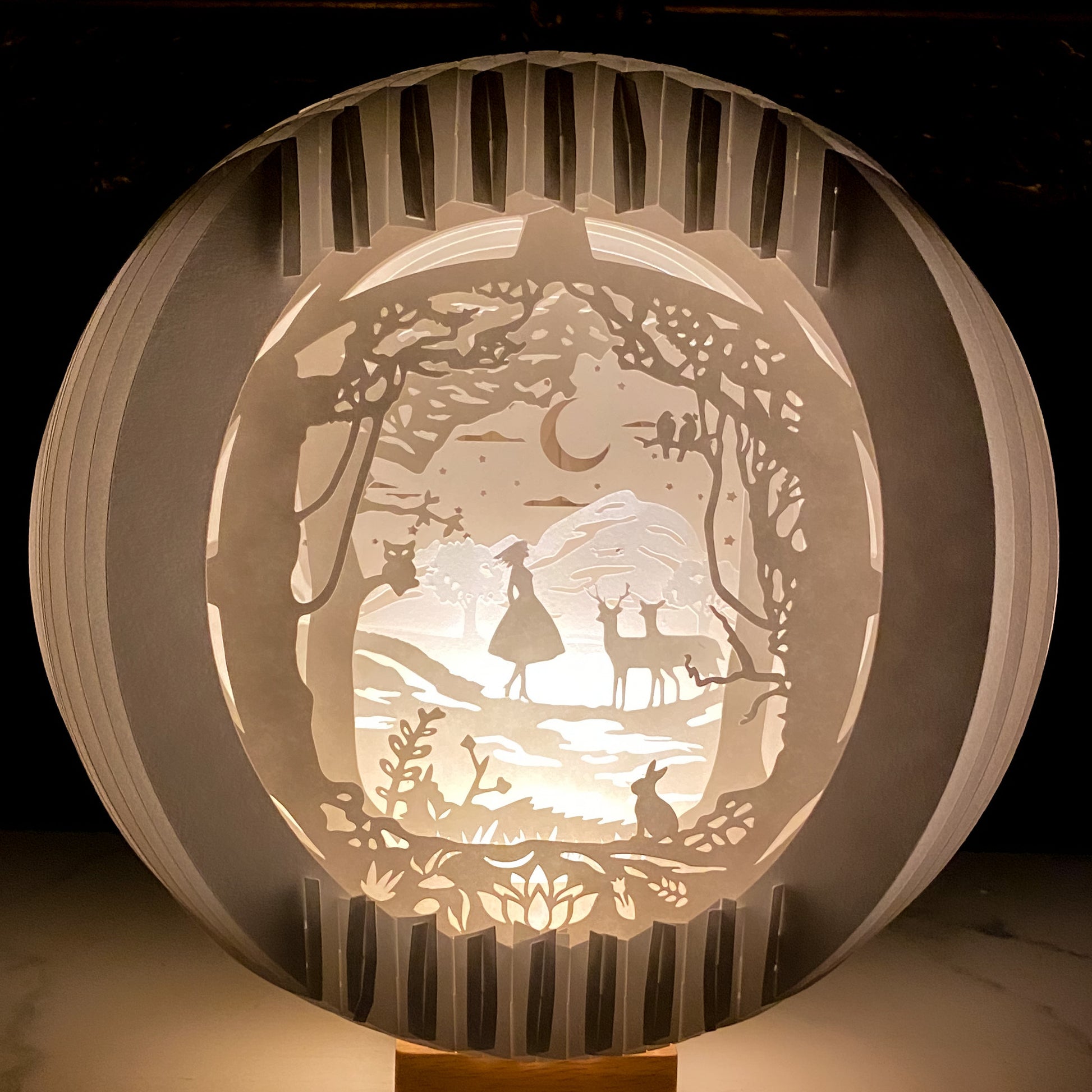 Beautiful handmade paper lamp with a whimsical image of a girl walking in a forest.