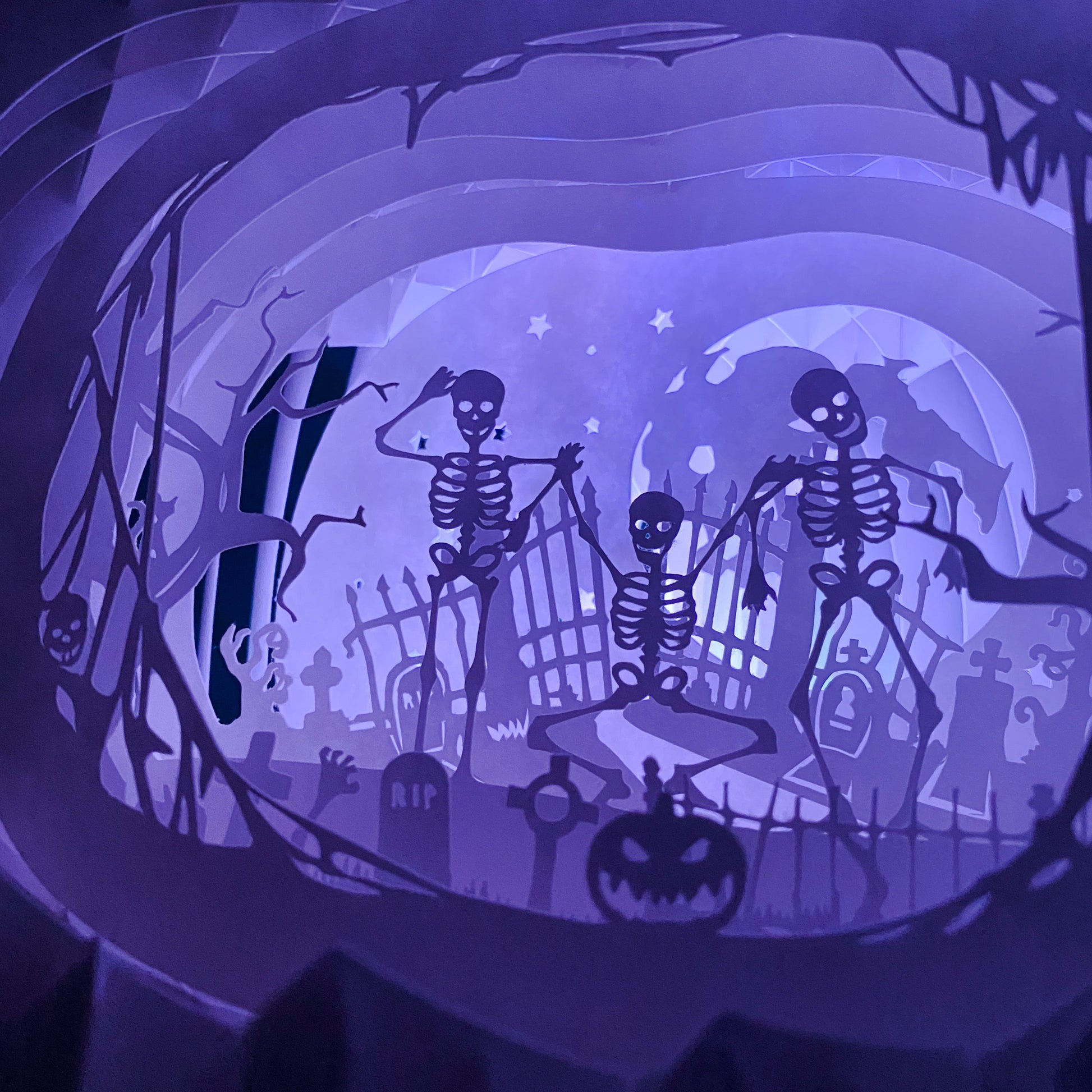 Let your spookiest imaginations come to life with this delightful paper lamp crafted with spooky images of skeletons in a pumpkin-shaped frame. This lamp is crafted with several layers of white paper and flat-folds for easy storage.