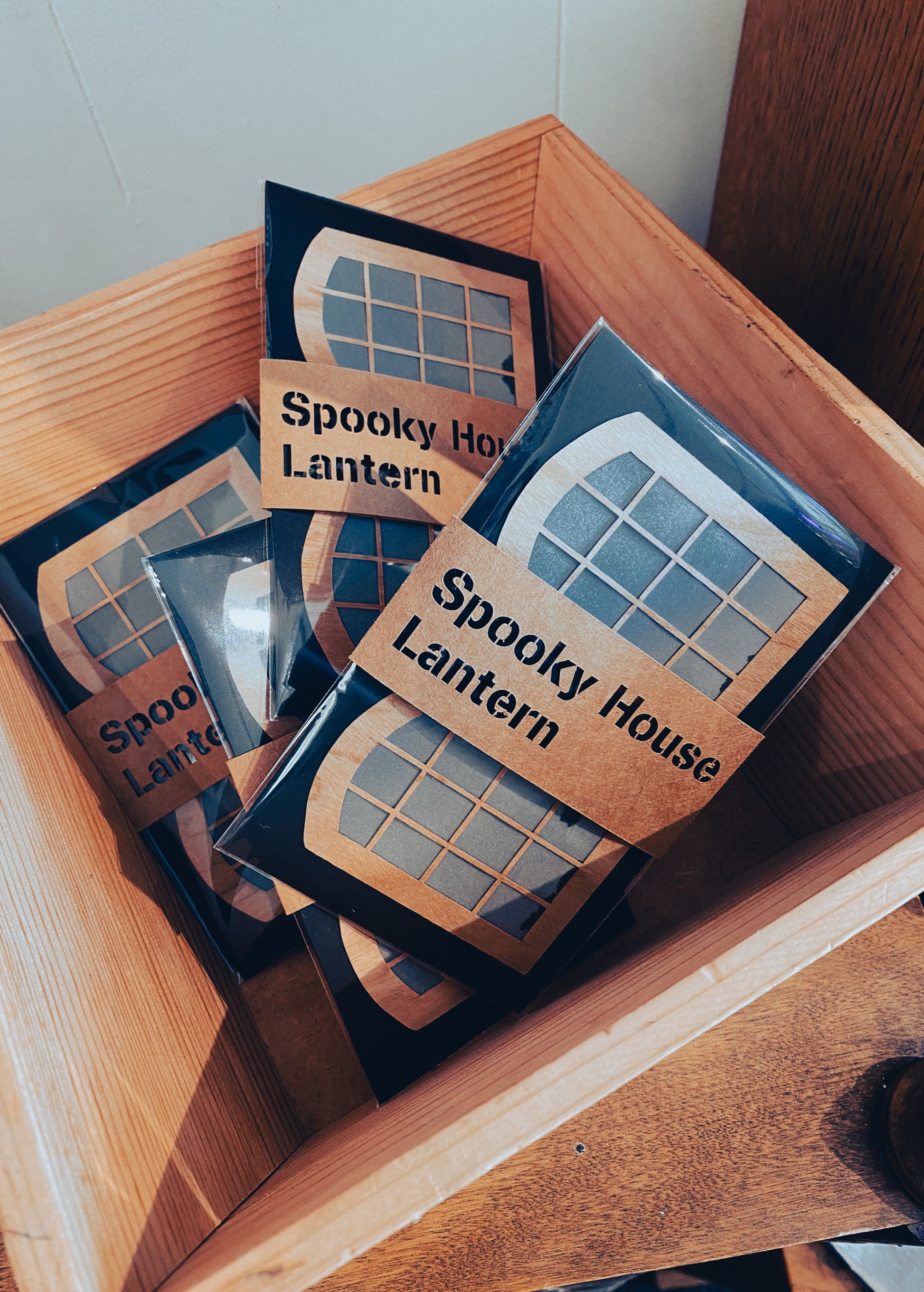 This Spooky Lantern is full of eerie delights! It folds flat for storage when not in use, but when opened it casts a spectral silhouette of a spooky house on each window! Tealight included; dimensions are 3" x 3" x 5" when open.
